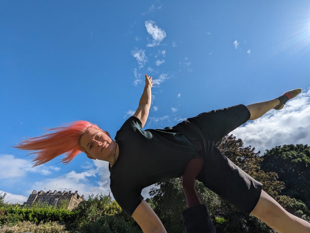 Emily works to empower flyers to take more control over skills and move away from the “flyer is an object to be thrown” mentality. She’s always down for shenanigans and silly group skills (very Portland), and is grateful for how much play, touch, and community acro adds to her life.